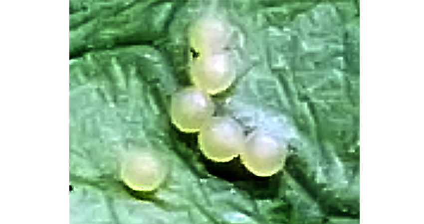 Depositados individualmente o en pequeños grupos (2-5) en las hojas, blanco crudo,