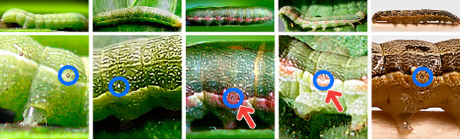 A veces manchas rosadas o anaranjadas alrededor de los espiráculos.