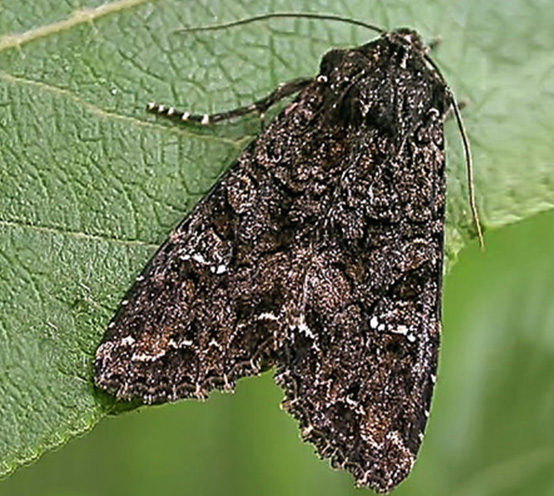 Polilla nocturna de coloración marrón negruzca a gris, con una envergadura alar de 35-45 mm.