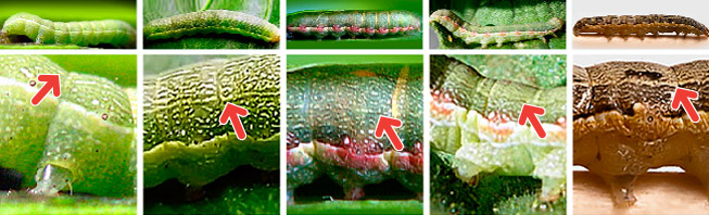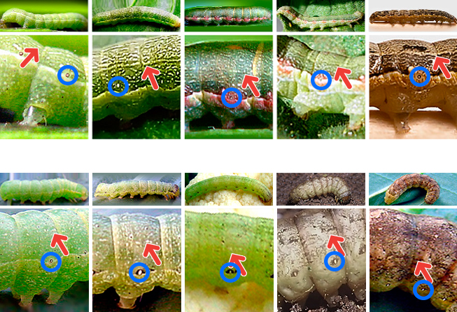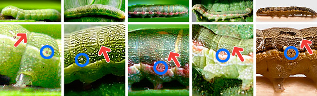 A veces manchas rosadas o anaranjadas alrededor de los espiráculos.