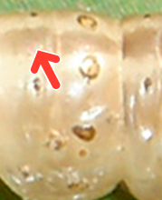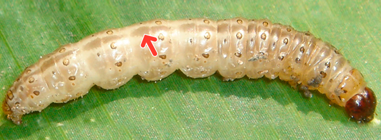 Seda lateral con tubérculo claro de borde oscuro (justo encima del espiráculo).
