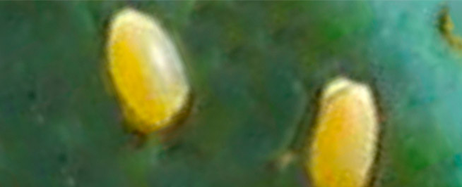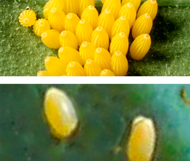 Puestos en ooplacas de 20 a 50 huevos en ambas caras de la hoja, alargados y amarillos.