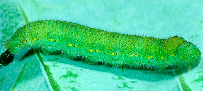 Cuerpo verde azulado, cubierto de pequeñas sedas con tubérculos negros. Estrecha banda dorsal amarilla. Tenue banda espiracular clara con manchas amarillas justo antes y detrás de los espiráculos.