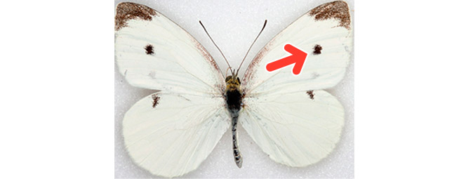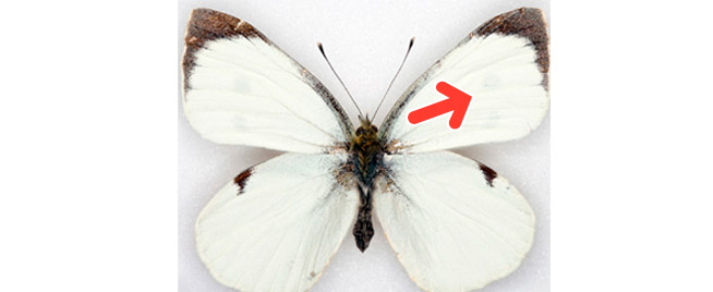Macho sin las manchas negras submarginales en la cara del ala anterior (solo en la cara inferior).