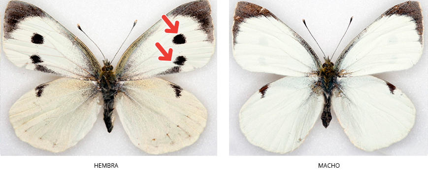 Alas anteriores blancas con puntas negras, dos manchas negras en la hembra, ausentes en el macho (en los machos estas dos manchas solo en la cara inferior).