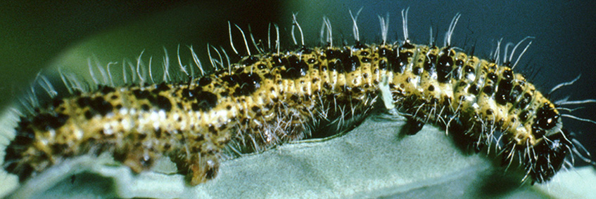 Cuerpo amarillento, con numerosas sedas blancas y grandes tubérculos negros.