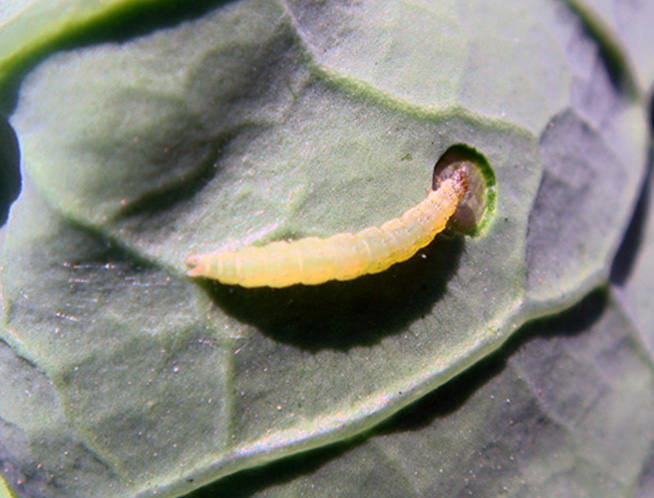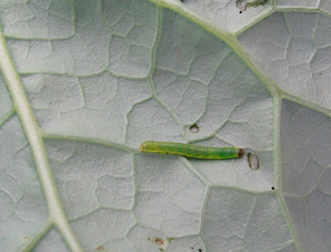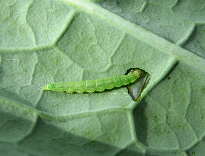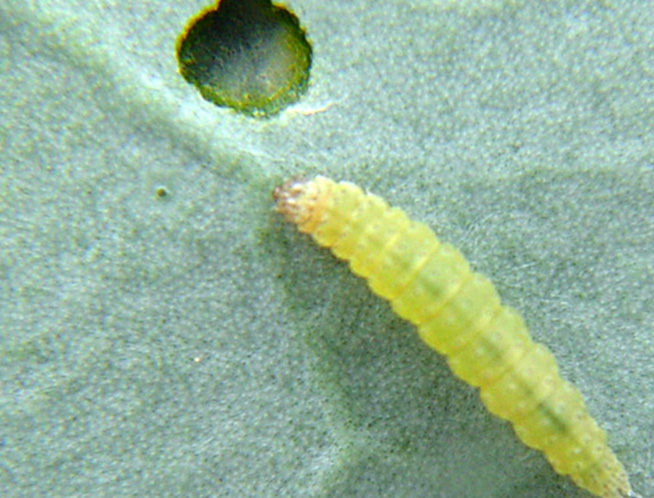 Las larvas recién emergidas realizan minas dentro de las hojas pero emergen para mudar.
