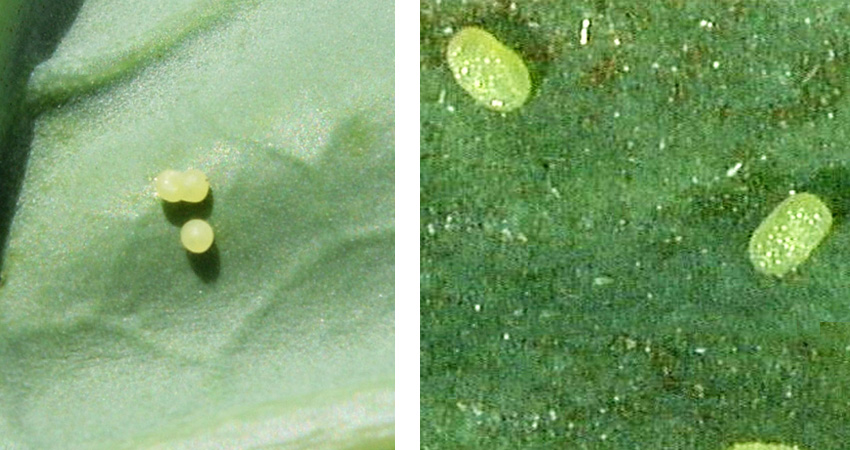 Puestos individualmente o en pequeños grupos de 2 a 8 huevos, amarillos o verdes pálidos, ovales y achatados.
