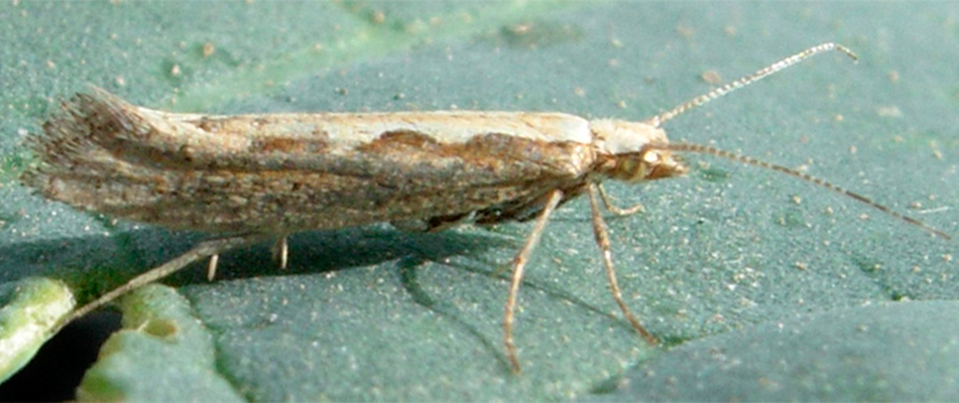 Polilla pequeña (6 mm de largo) y esbelta, de color marrón grisáceo con antenas pronunciadas.