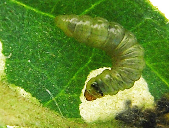 Las larvas minan las hojas, creando unas galerías bien visibles, y penetran en los frutos. Las galerías de los tallos causan la malformación de la planta.