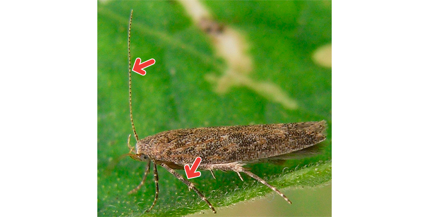 Largas antenas filiformes, las patas y los palpos presentan bandas grisáceas y marrón oscuras.